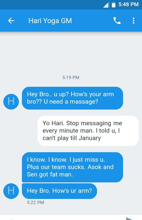 9. HORNETS: The Buzz around town is that GM Hari has been calling Nishan Thurai non-stop to check up on his injury and offering personal hot oil massages to help him heal faster. I was able to intercept a text msg convo between the two which I have posted below. Hornets only win comes against the bottom feeding Lakers so much cannot be said about the Hornets until Nishan returns to the roster (expected to return January 2019).